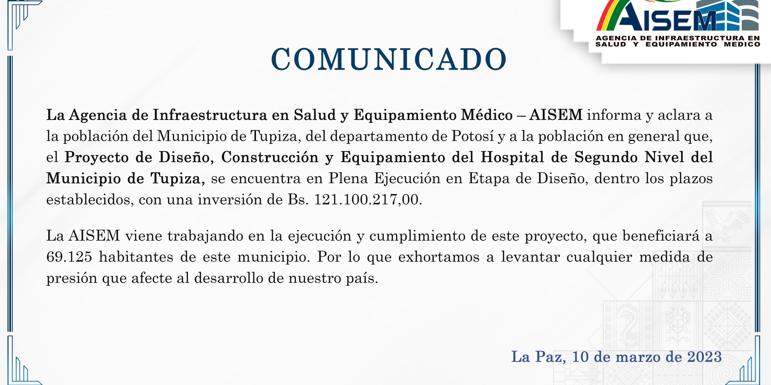Mar102023. Publicaciones RelacionadasGobierno nacional realiza entrega oficial de equipamiento médico al Hospital de Segundo Nivel “Solomón Klein” de Sacaba25 abril, 2025Gobierno nacional avanza en la coordinación para el equipamiento del Hospital Oncológico de Tarija21 abril, 2025AISEM reafirma compromiso con la salud pública durante su Rendición de Cuentas Inicial 202521 abril, 2025
